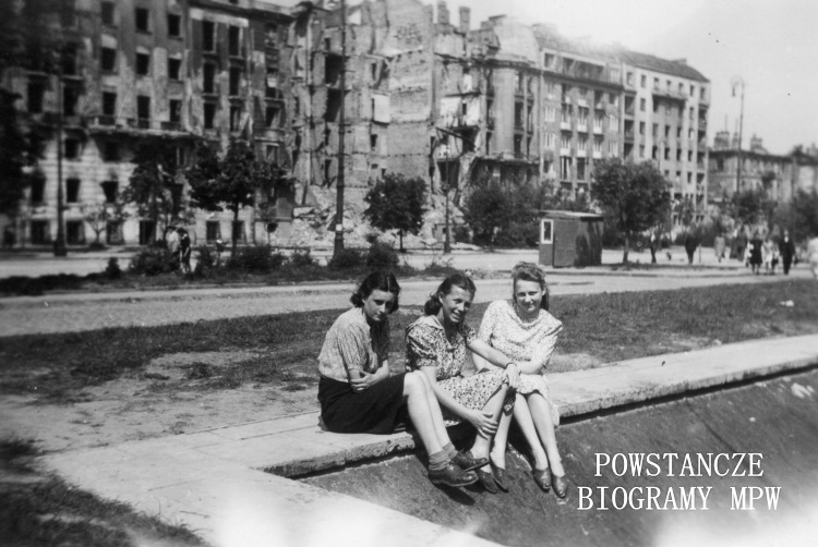 po prawej: rejon skrzyżowania Nowego Światu z Al. 3 maja. Dziewczęta z zastępu harcerskiego Pędziwiatrów z drużyny Grupa Wykonawcza przy Kwaterze Głównej Szarych Szeregów. Od prawej: Krystyna Wilczyńska, Anna Złoch (ps. Grażka), Zofia Zaremba.