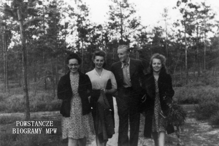 po lewej: Okolice Warszawy. Konspiracyjne szkolenie wojskowe w lasach na linii otwockiej. Od lewej: zastępowa Hanna Darda ps. Ala, Anna Złoch ps. Grażka, Krystyna Biernacka ps. Kali. Pomiędzy nimi Stanisław Świętochowski ps. Sęp. Ze zbiorów Muzeum Powstania Warszawskiego