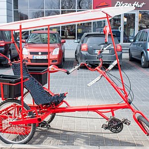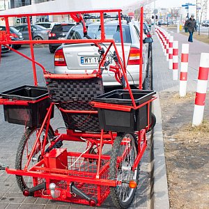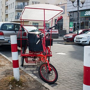 Taki trójkołowiec zaparkował dziś przy alei KEN 85. Wyraźnie widać, że ktoś sam skonstruował pojazd. Rower wzbudził powszechne zainteresowanie wśród przechodniów. My również postanowiliśmy przyjrzeć się mu z bliska. Trójkołowiec był na tyle interesujący, że postanowiliśmy urządzić mu sesję fotograficzną. Szkoda tylko, że nie mieliśmy okazji poznać jego właściciela...