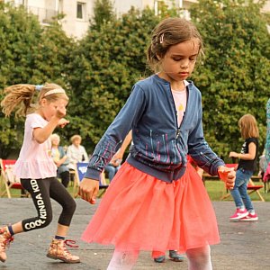 Tak jak na każdej potańcówce można było też coś zjeść, choć tym razem wybór był niewielki, bo tylko popcorn i wata cukrowa. Za to wody było pod dostatkiem, cała cysterna wypełniona warszawską kranówką, po którą ustawiały się kolejki, zwłaszcza dzieci, których w Sadku Natolińskim było bardzo dużo. Dla nich przygotowane były specjalne animacje i dmuchana zjeżdżalnia. Cieszyła się ogromną popularnością.