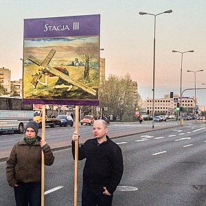 Druga stacja była... na środku ulicy - alei Komisji Edukacji Narodowej, przy skrzyżowaniu z Herbsta. Symbolicznie oznaczona przez dwóch mężczyzn trzymających emblemat. I taka właśnie co roku jest ta największa ursynowska Droga Krzyżowa. Skromna, zagłębiona w medytacji, o bogatej symbolice.