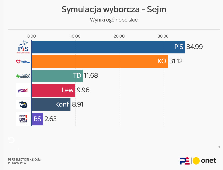 Sondaże i eksperci dają wygraną PiS, choć najczęściej niewystarczającą do utworzenia nowego rządu. Wg ostatniej prognozy wyborczej Pers Election dla Onetu wyniki mogą być następujące: