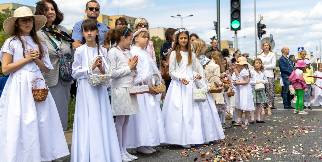 W centrum procesji, pod baldachimem szedł ksiądz trzymający monstrancję z Najświętszym Sakramentem, czyli konsekrowaną Hostią. Pomagali mu i otaczali go członkowie Zakonu Rycerzy św. Jana Pawła II w czarno-żółtych strojach. To katolickie stowarzyszenie mężczyzn. Przed kapłanem szły dziewczynki z tegorocznych komunii św. w białych sukienkach, które zgodnie z tradycją sypały płatki kwiatów pod nogi procesji. W tle rozbrzmiewały pieśni religijne, a na twarzach śpiewających i maszerujących malowało się pełne skupienie.