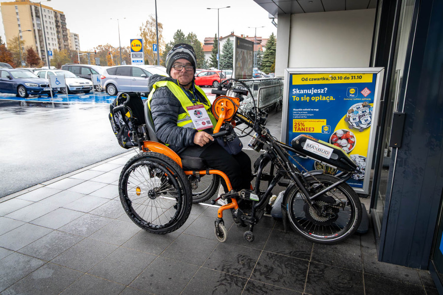 Spotykamy go w środę pod wejściem do Lidla na Kabatach. Na co zbiera pieniądze? Na nowy wózek oraz dostawkę rowerową, która pozwala mu samemu poruszać się, ale też startować w maratonach.