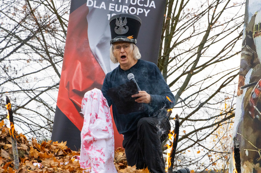 Punktem kulminacyjnym uroczystości była dramatyczna inscenizacja przygotowana przez Olgierda Łukaszewicza i uczniów LXX Liceum Ogólnokształcącego im. Aleksandra Kamińskiego. Wcielający się w rolę Jastrzębowskiego aktor wspiął się na górkę między pochodniami i na klęczkach, spośród stert liści, wydobył zakrwawioną koszulę. Jego monologi przerywane były fragmentami Konstytucji dla Europy wygłaszanymi przez licealistów. Przedstawienie było pełne emocji i napięcia.