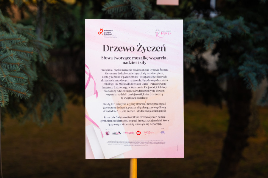„Drzewo Życzeń” pod Narodowym Instytutem Onkologii to nie tylko ozdoba świąteczna, to instalacja, która ma budować poczucie wspólnoty i solidarności, a także przypominać każdej kobiecie mierzącej się z nowotworem, że nie jest w tej walce sama.