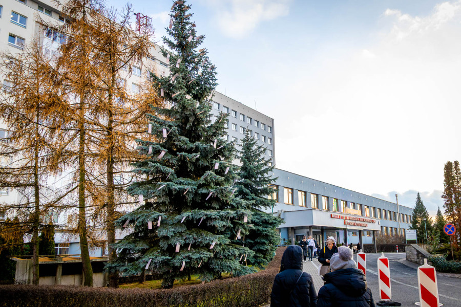 Kartki z życzeniami i pragnieniami pacjentów zawisły zamiast bombek na jednym z drzew iglastych rosnących przed wejściem do NIO.