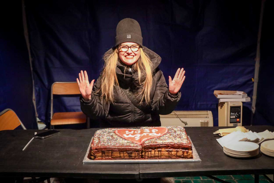 Zwieńczeniem dnia było tradycyjne „Światełko do nieba” pod urzędem dzielnicy. O 20 mieszkańcy ustawili się w kształt wielkiego serca, a strażacy odpalili race. Na zmarzniętych czekał gigantyczny, 12-kilogramowy tort czekoladowo-pomarańczowy, upieczony własnoręcznie przez radną dzielnicową Olgę Górną.