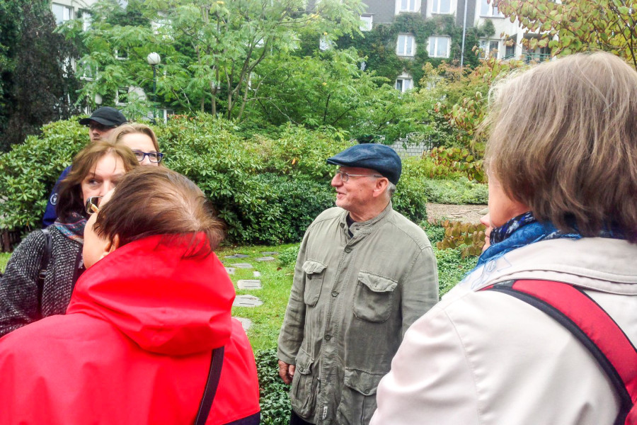 powyżej: spacer z Markiem Budzyńskim po północnym Ursynowie, zorganizowany w ramach III Festiwalu Otwartych Mieszkań, przez warszawski oddział Towarzystwa Opieki nad Zabytkami. Spacerowicze w miejscu zaprojektowanym przez prof. Budzyńskiego - w kompleksie budynków przy Pasażu Ursynowskim