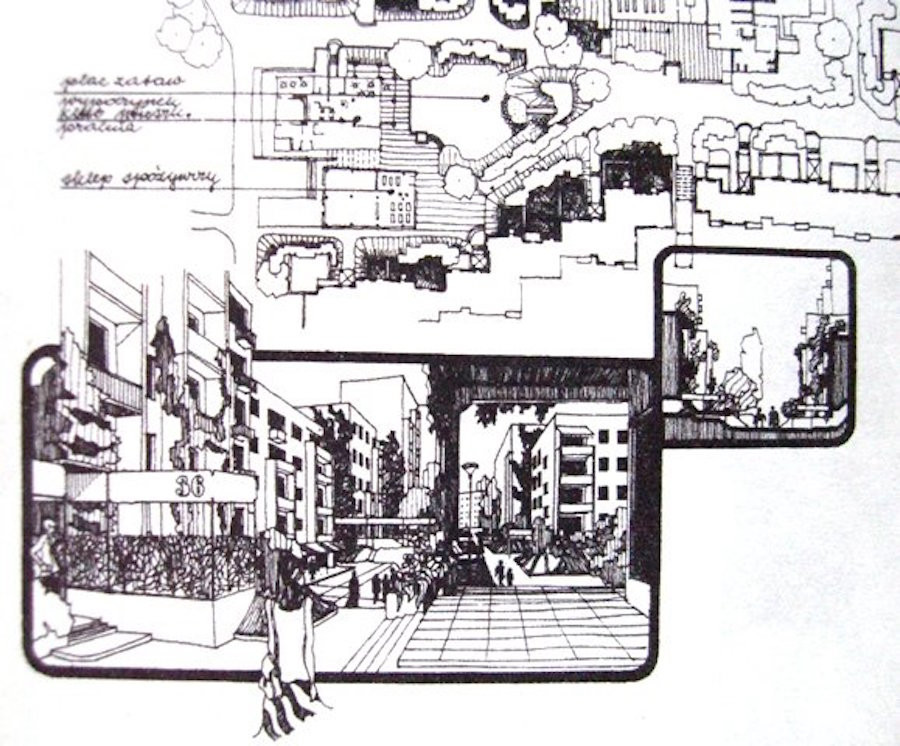 powyżej: jeden z rysunków pasażu handlowo-usługowego w koncepcji "koncentracji liniowej". Większość z tych założeń pozostała na papierze