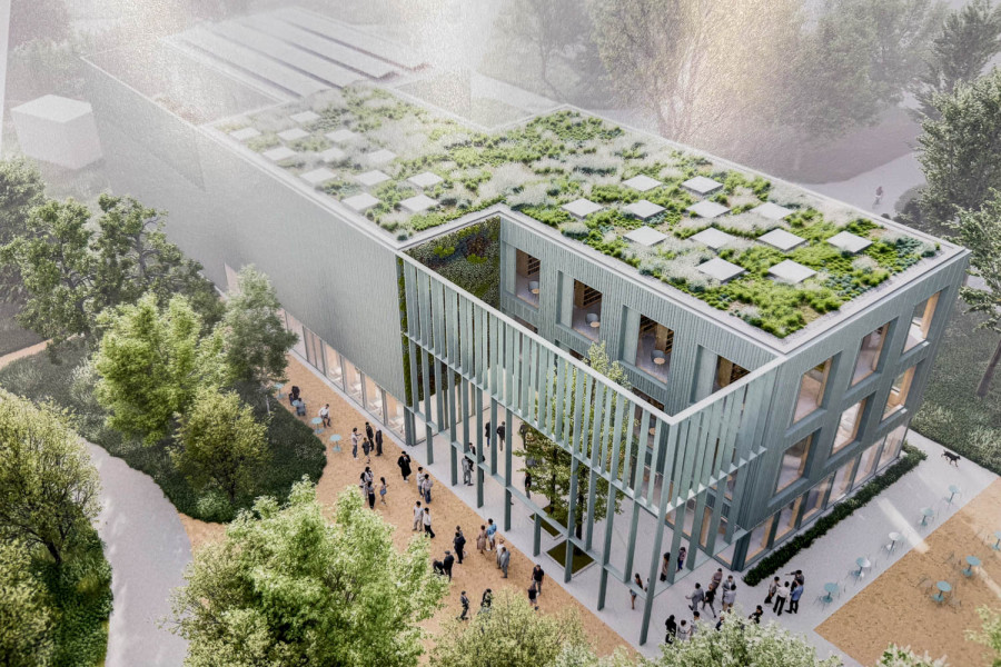 Architekci przewidzieli ogrody deszczowe, zielone dachy, zieloną ścianę, panele fotowoltaiczne oraz system retencji wody deszczowej.