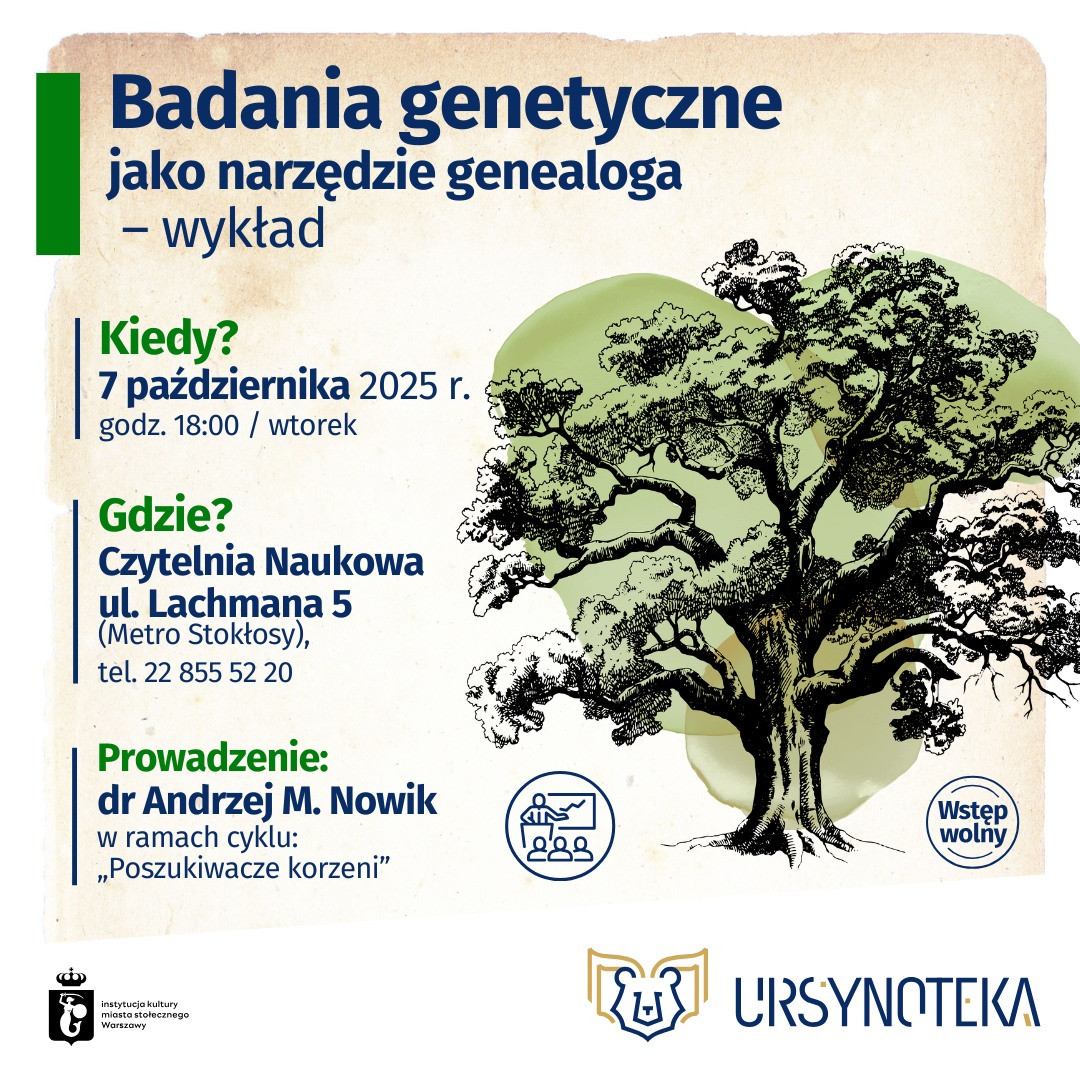Poszukiwacze korzeni! Już 7 października (wtorek) o godz. 18:00 zapraszamy do Czytelni Naukowej przy ul. Lachmana 5 (Metro Stokłosy) na wykład: „Badania genetyczne jako narzędzie genealoga”.