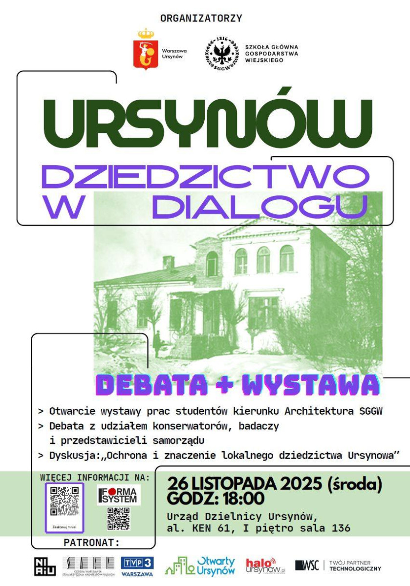 Wydarzenie pod honorowym patronatem:Burmistrza Dzielnicy Ursynów m.st. Warszawy. Goście specjalni: Cezary Holdenmajer – Zastępca Burmistrza Dzielnicy Ursynów, prof. dr hab. inż. Eugeniusz Koda – Dyrektor Instytutu Inżynierii Lądowej SGGW, dr hab. inż. arch. Jeremi Królikowski – prof. SGGW, dr Michał Krasucki – Stołeczny Konserwator Zabytków, Paweł Lenarczyk – Wiceprzewodniczący Rady Dzielnicy Ursynów. Prowadzenie:dr inż. arch. Paulina Filas-Zając, wykładowca SGGW. Organizatorzy:Szkoła Główna Gospodarstwa Wiejskiego w WarszawieWBiIŚ – kierunek ArchitekturaUrząd Dzielnicy Ursynów m.st. Warszawy. Więcej w wydarzeniu.
