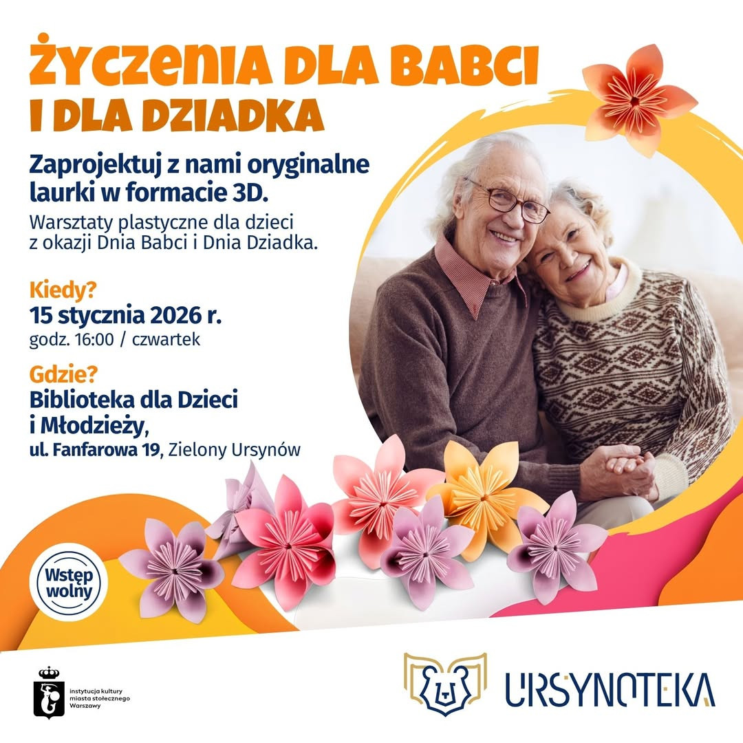 Już 15 stycznia 2026 (czwartek) o godz. 16.00 spotykamy się w aby wspólnie stworzyć kolorowe, przestrzenne i jedyne w swoim rodzaju laurki dla Babć i Dziadków. Będzie twórczo, radośnie i bardzo rodzinnie!