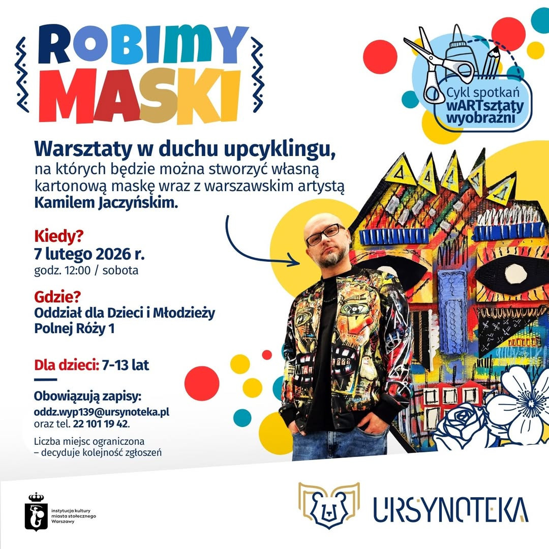 Czy wiedzieliście, że zwykły karton może stać się dziełem sztuki? W ramach cyklu wARTsztaty wyobraźni zapraszamy na niezwykłe spotkanie, podczas którego damy drugie życie niepotrzebnym opakowaniom. Tym razem zaproszenie przyjął wyjątkowy gość – warszawski artysta, promotor kultury i człowiek o nieskończonej wyobraźni: Kamil "Jakuza" Jaczyński. Pod jego okiem zamienicie szary karton w niesamowite, kolorowe maski. To doskonała okazja, by połączyć zabawę z nauką o ekologii i sprawdzić, jak działa magia upcyclingu.