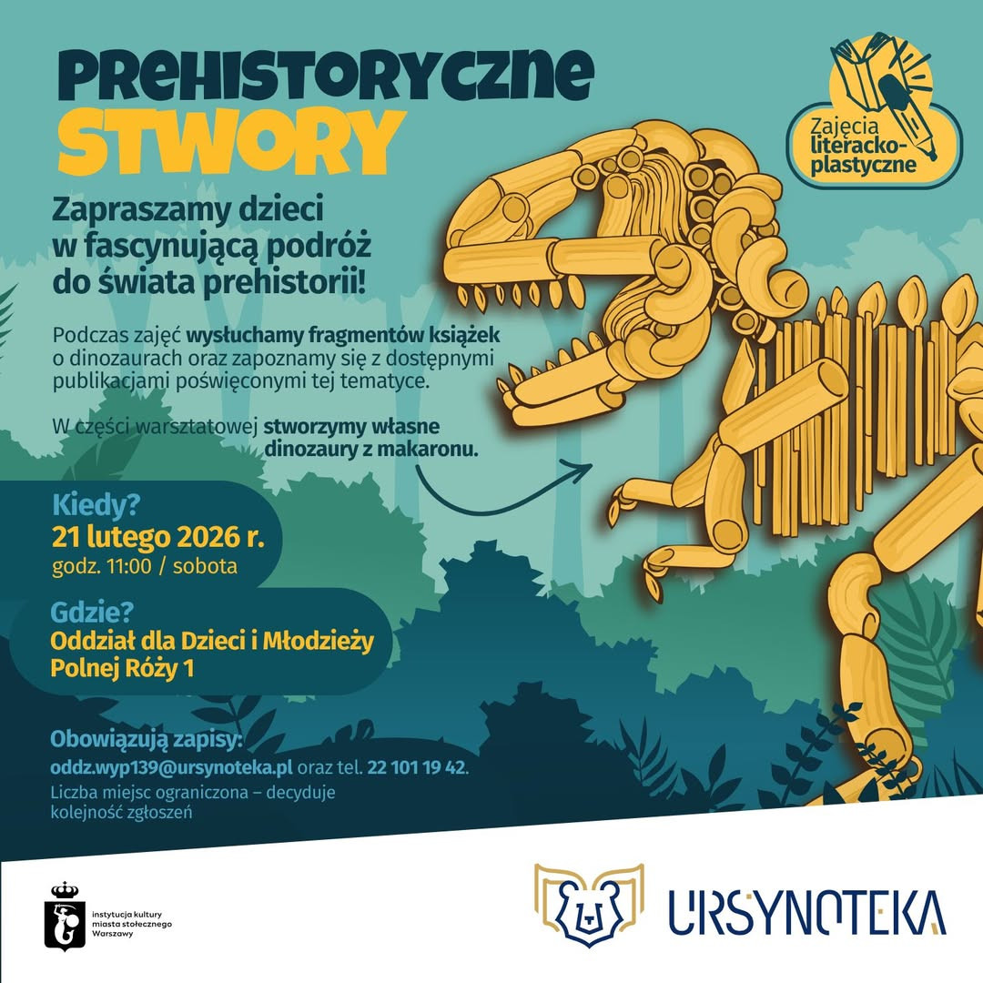 Podróż do świata dinozaurów w Ursynotece! Masz w domu małego odkrywcę, który zna nazwy wszystkich prehistorycznych gadów? A może po prostu chcecie przeżyć niesamowitą przygodę? Zapraszamy na warsztaty, które przeniosą nas miliony lat wstecz! Temat: „Prehistoryczne stwory”.