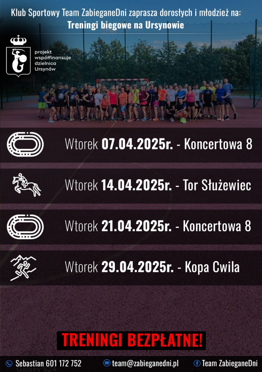 Klub Sportowy Team ZabieganeDni i Urząd Dzielnicy Ursynów zapraszają na wspólne, bezpłatne treningi biegowe.