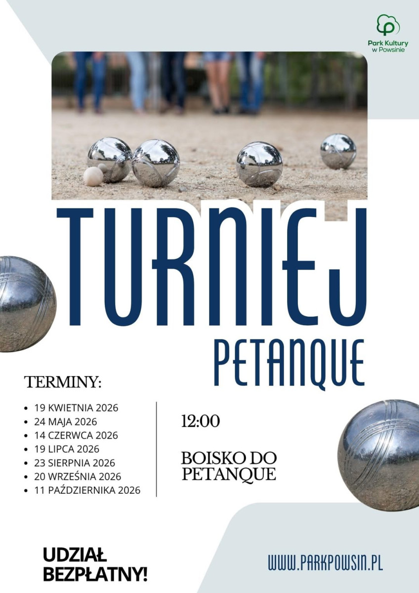Terminy: 19.04, 24.05, 14.06, 19.07, 23.08, 20.09 oraz 11.10.2026. Start zawsze o godz. 12:00. Boisko do pétanque (przy parku linowym, za dużym amfiteatrem). Udział jest bezpłatny - nie prowadzimy zapisów, po prostu przyjdźcie i grajcie! Sprzęt zapewniamy na miejscu. Zabierz znajomych i wpadaj na rozgrywki!