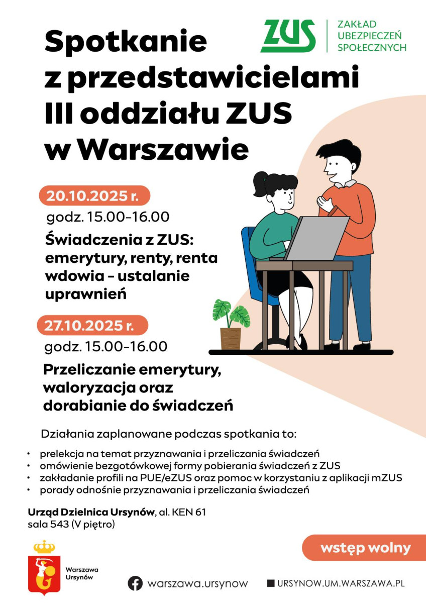 Seniorzy Ursynowa będą mieli okazję wziąć udział w dwóch spotkaniach informacyjnych z przedstawicielami III Oddziału Zakładu Ubezpieczeń Społecznych w Warszawie.