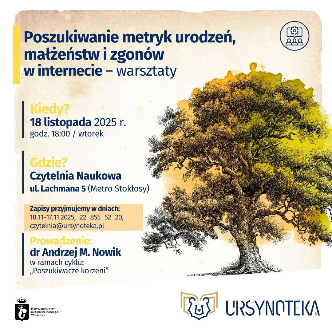 Prowadzenie: dr Andrzej M. Nowik (w ramach cyklu „Poszukiwacze korzeni”). Nie przegap okazji, by nauczyć się, jak korzystać z akt metrykalnych i stanu cywilnego w odkrywaniu historii swojej rodziny. Zapisy przyjmujemy wyłącznie w dniach 10–17 listopada 2025 r., tel. 22 855 52 20 lub mailowo: [email protected]