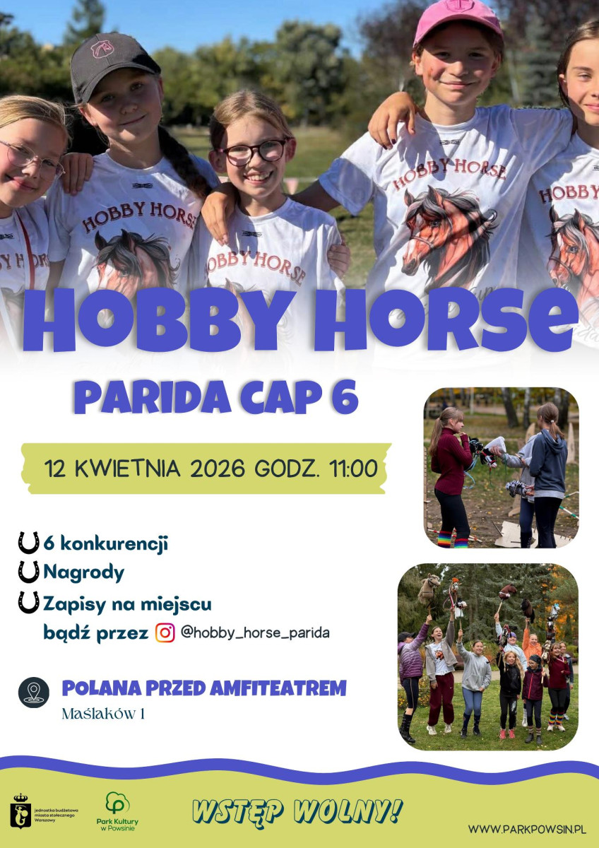 Już 12 kwietnia 2026 r. o godzinie 11:00 zapraszamy do Parku Kultury w Powsinie na wyjątkowe zawody Hobby Horse! Udział bezpłatny.