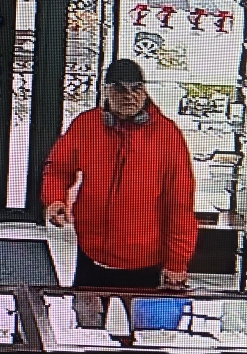 Kamery monitoringu zarejestrowały dwóch podejrzanych. Pierwszy z nich to mężczyzna w wieku około 50-60 lat, średniej budowy, mierzący około 170 cm wzrostu. Ma siwy zarost na twarzy i charakterystyczne bruzdy nosowe. W dniu zdarzenia nosił szare słuchawki bezprzewodowe na szyi, czarną czapkę z daszkiem, czerwoną kurtkę na suwak, czarne spodnie i ciągnął za sobą niebieską podróżną walizkę.