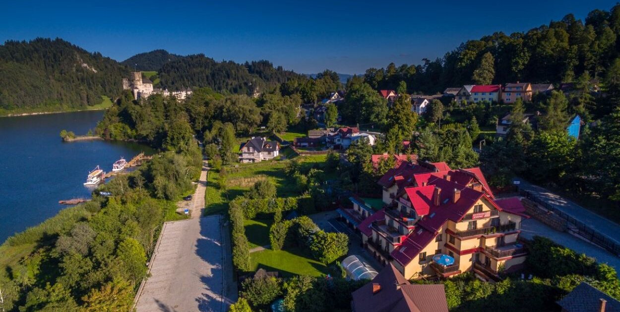 Niedzica to najbliższa miejscowość od strony polskiej — mała, spokojna, z widokiem na wodę z większości okien. Dla rodzin i par dobrym wyborem jest pensjonat w Niedzicy nad jeziorem, szczególnie taki z pełnym wyżywieniem — śniadania i obiadokolacje na miejscu rozwiązują kwestię restauracji, która w sezonie potrafi być kłopotem. Praktyczne plusy: parking na terenie, plac zabaw i grill dla gości, bezpośredni dostęp do brzegu piechotą.