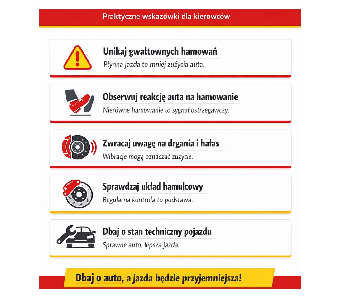 Powyższa infografika przedstawia pięć kluczowych nawyków, do których warto stosować się na co dzień. Pierwszym z nich jest unikanie gwałtownych hamowań, ponieważ płynna jazda z wyprzedzeniem redukuje zużycie układu hamulcowego i poprawia ogólny komfort podróży. Nie mniej istotna jest obserwacja reakcji auta podczas zwalniania, gdyż nierównomierne hamowanie lub ciągnięcie pojazdu w jedną stronę to sygnały, których nie należy ignorować. Drgania wyczuwalne na pedale hamulca lub kierownicy mogą z kolei świadczyć o zużyciu lub odkształceniu tarcz, dlatego każda taki objaw powinien być dla kierowcy sygnałem skłaniającym do rychłej wizyty w warsztacie.