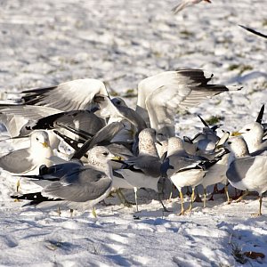 Moim zdaniem, nie jest konieczne dokarmianie mew, kiedy Wisła nie zamarzła całkowicie i ptaki mają dostęp do ryb. Ja dokarmiam małe wróblowe, gołębie i przy okazji krukowate, jeśli smakują im ziarna, kasze, płatki. Oczywiście - daję im orzechy, ale trochę, bo ten rarytas jest bardzo drogi ...