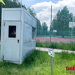Dziś użytkownicy boiska zauważyli przy nim szpetną blaszaną budę. W środku jest miejsce dla jednej osoby, która może obserwować co się dzieje na boisku.