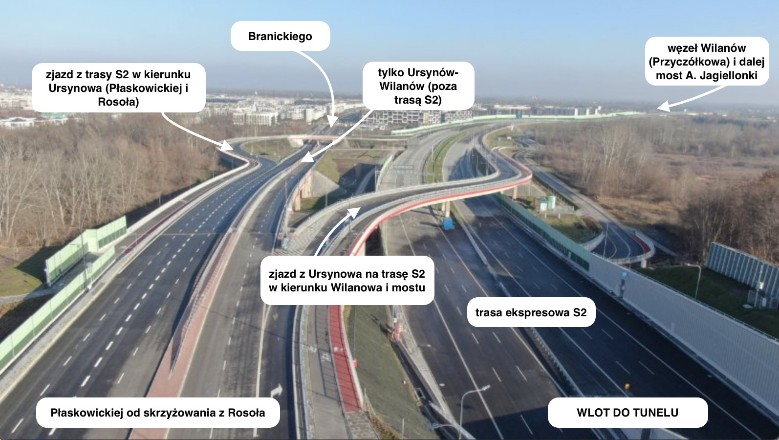 Z nieoficjalnych informacji wynika, że ul. Branickiego wilanowski ratusz ma zamiar oddać kierowcom w poniedziałek, 20 grudnia rano. Władze Wilanowa trzymają kciuki za otwarcie tunelu, choć w wilanowskim ratuszu słyszmy, że ulica łącząca bezpośrednio Ursynów i Wilanów zostanie udostępniona kierowcom niezależnie od decyzji w sprawie ursynowskiego odcinka trasy S2. Pytanie czy odcinek przy węźle Ursynów Wschód zostanie otwarty już w poniedziałek również przez GDDKiA, która nim administruje. Wg uzgodnienia z miastem drogowcy otworzą przedłużenie Płaskowickiej również rano. Obie ekipy z obu stron ulicy mają skoordynować swoje działania.
