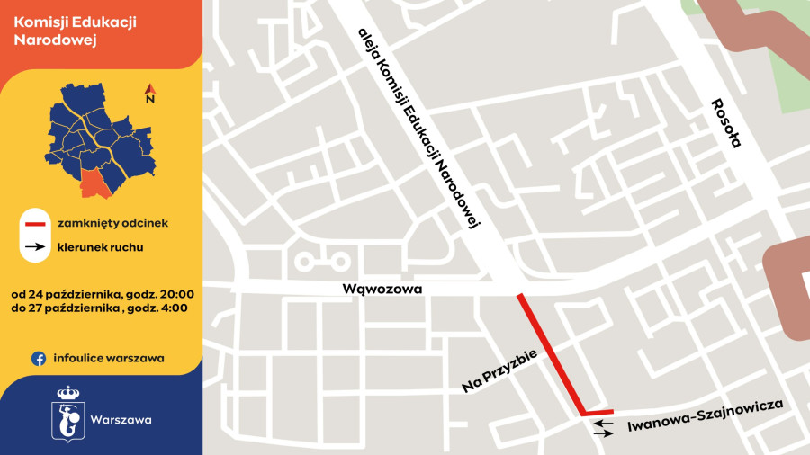 Prace ruszą w piątek 24 października o godzinie 20 i potrwają do poniedziałku 27 października do 4 rano. Aleja Komisji Edukacji Narodowej zostanie zamknięta w obu kierunkach na odcinku ponad 370 metrów - od Wąwozowej do Iwanowa-Szajnowicza. Drogowcy zamkną także pas ulicy Iwanowa-Szajnowicza przy wyjeździe z pętli autobusowej. Kierowcy przejadą do alei KEN wahadłowo po drugiej stronie wysepki.