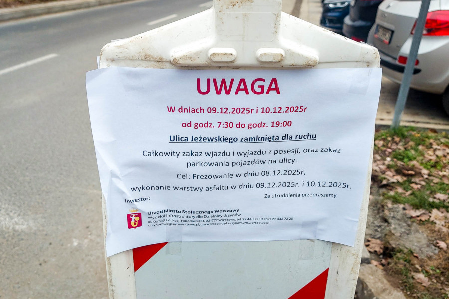 W piątek rozwieszono informację że w dniach 9-10.12.2025 cała ulica będzie wyłączona z ruchu. Oznacza to uniemożliwienie wjazdu do garaży i na miejsca parkingowe kilkuset samochodów. Paraliżuje to życie mieszkańców na całe 2 dni. Gdzie przestawić tyle samochodów? Jak w razie potrzeby dojedzie do nas karetka? Dla mnie samochód jest w tych dniach niezbędny