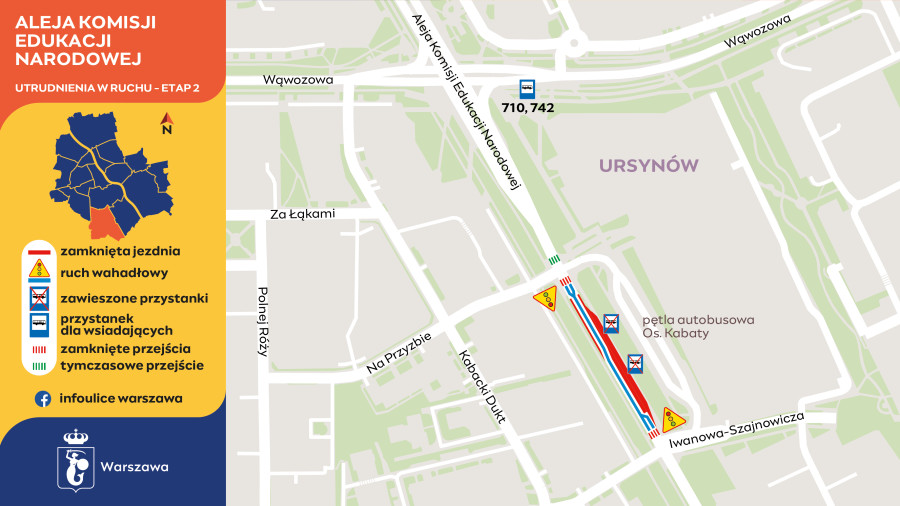 Dla pasażerów korzystających z podmiejskich linii 710 i 742 oznacza to zmiany. Ostatnim przystankiem na Ursynowie stanie się Metro Kabaty 02, zlokalizowany w alei KEN za skrzyżowaniem z ulicą Wąwozową. Z kolei osoby planujące podróż w kierunkach Targowisko (linia 710) oraz Rynek (linia 742) będą musiały kierować się na przystanek Metro Kabaty 03, znajdujący się bezpośrednio na ulicy Wąwozowej.