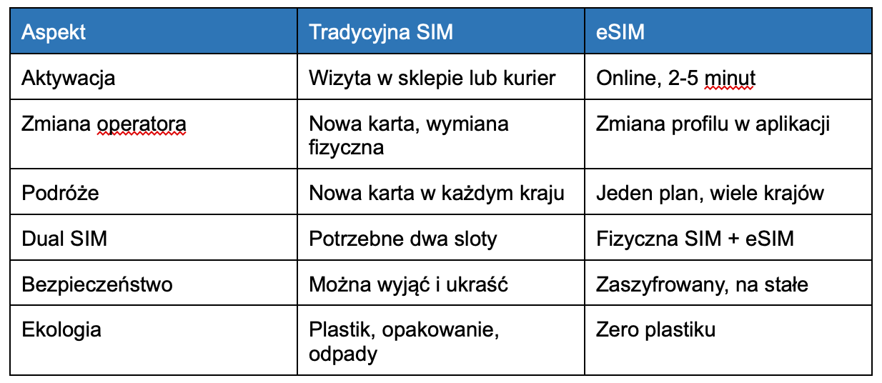 Nie musisz iść do sklepu operatora, nie musisz czekać na kuriera z kartą SIM, nie musisz szukać narzędzia, żeby otworzyć tackę. Pobierasz aplikację, skanuje kod, aktywacja trwa minuty. Jeśli zmieniasz operatora – robisz to z kanapy.