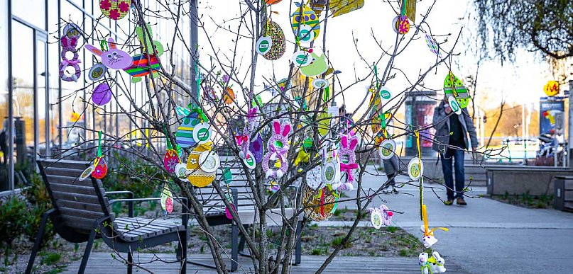 Wielkanocna eksplozja przy ratuszu! Wszystko za sprawą setek wykonanych przez dzieci ozdób, które zawisły na okolicznych drzewach i krzewach. To już czwarta edycja przedświątecznej akcji, która zamieniła plac przed urzędem dzielnicy w kolorowy przystanek.