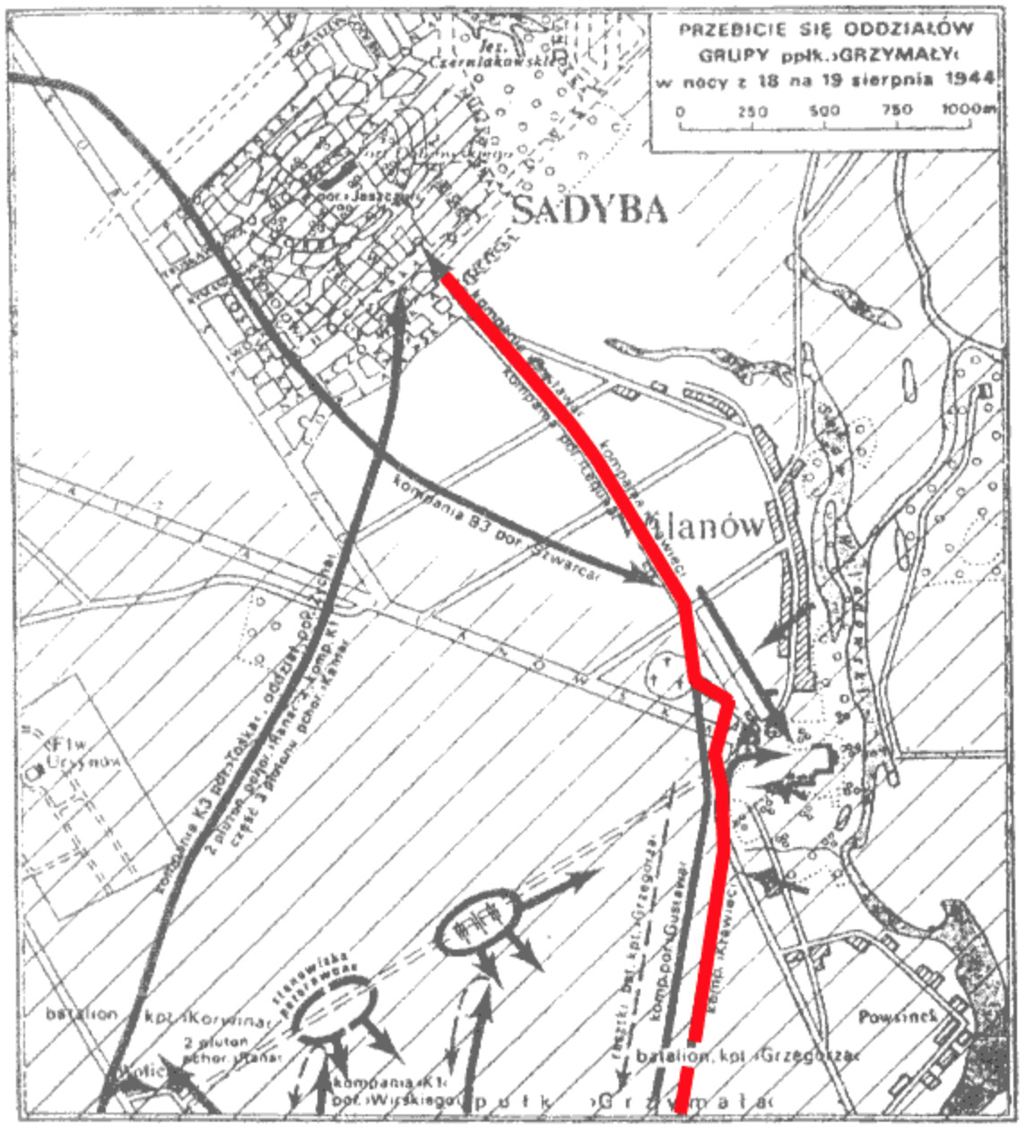 W nocy z 18 na 19 sierpnia 1944 r. tzw. grupa Grzymały stworzona z VII obwodu AK „Obroża”, z niedobitków z Mokotowa i z Ochoty, na apel Bora-Komorowskiego, wyrusza w kierunku Sadyby. Wcześniej oddziały koncentrują się w Lasach Chojnowskich a potem przechodzą przez Las Kabacki. Gdy przychodzi noc atakują Wolicę, Wilanów i tamtejsze stanowiska artylerii przeciwlotniczej.