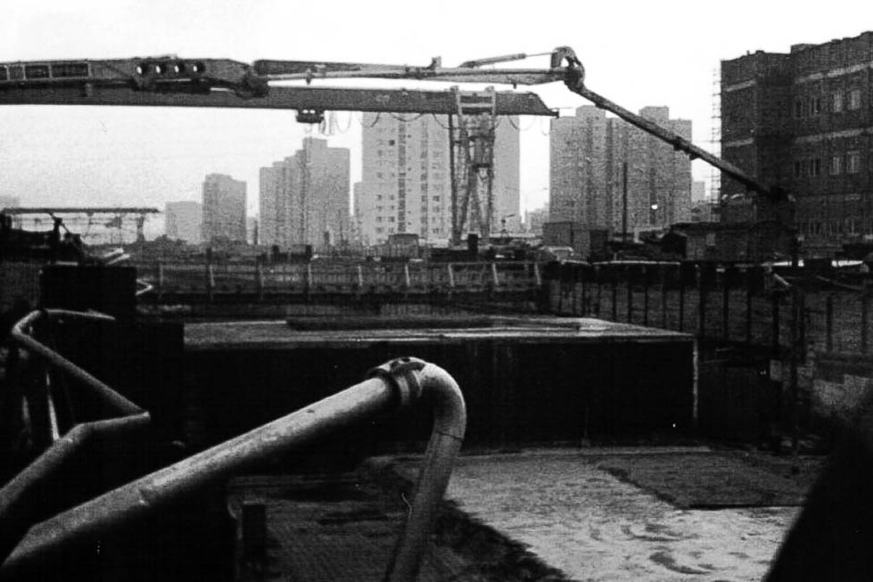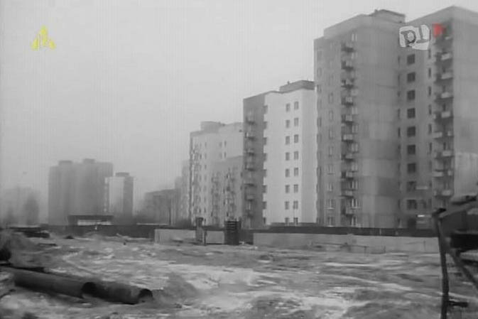 Widok zza płotu budowy stacji metra Ursynów na ulicę Koncertową. Kadr z kroniki PKF 3/88/ursynow.org.pl