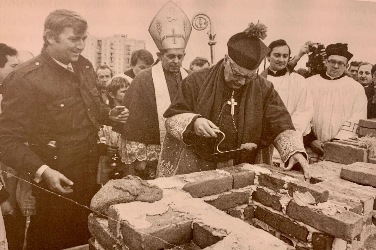 powyżej: Wmurowanie kamienia węgielnego 28 listopada 1982 r. Po lewej kierownik budowy inż. Paweł Zdanowicz, po prawej, z kielnią - bp Jerzy Modzelewski - źródło: "Pierwszy na Ursynowie", wyd. ks. T. Wojdat