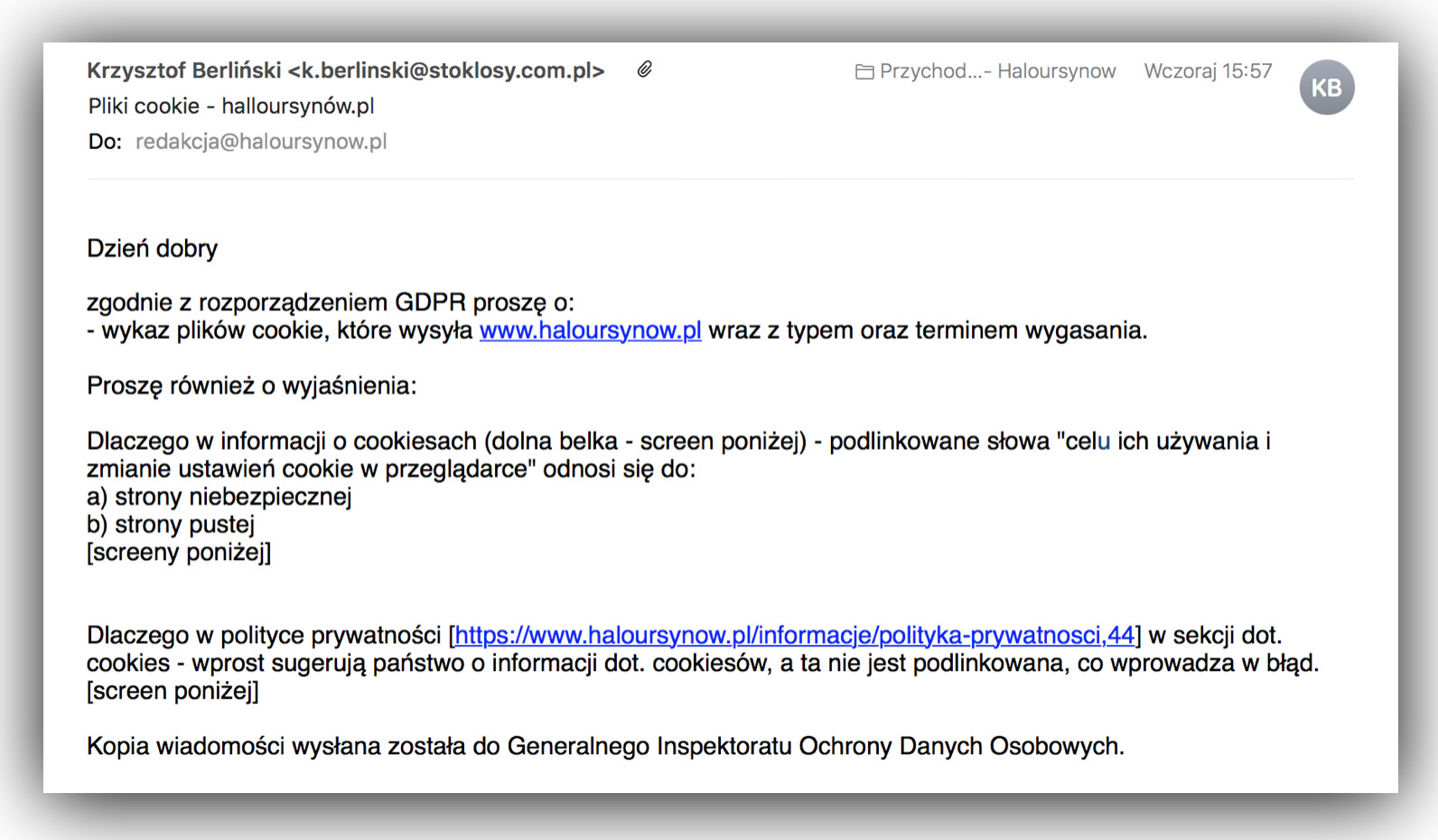 Otóż dzień (!!!) po naszym artykule o ochronie walnego (dodajmy, zawierającego również stanowisko prezesa) Krzysztof Berliński, pisząc ze służbowej skrzynki mailowej, poinfomował nas o rzekomych uchybieniach związanych z RODO w naszym serwisie. W grzecznym, acz stanowczym mailu nie omieszkał dodać, że kopia wiadomości trafiła także do Generalnego Inspektora Ochrony Danych Osobowych.