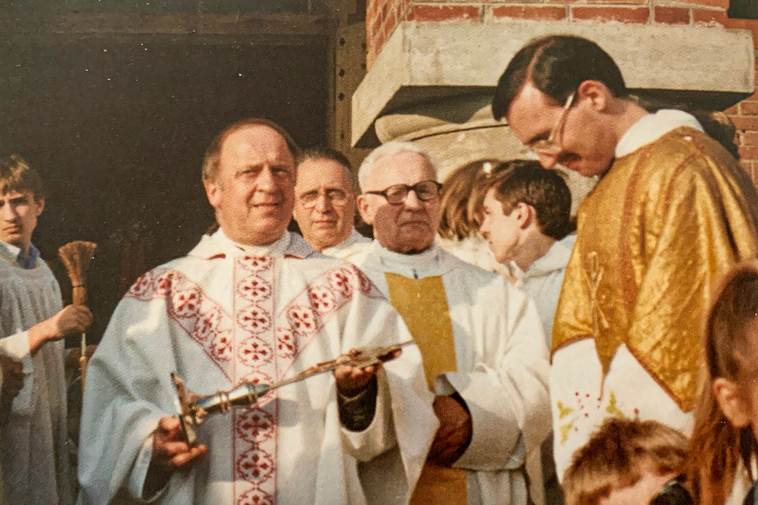 powyżej: ksiądz T. Wojdat podczas uroczystości poświęcenia kościoła, niżej: podczas budowy świątyni - źródło: arch. prywatne księdza/książka "Pierwszy na Ursynowie", Warszawa 2015