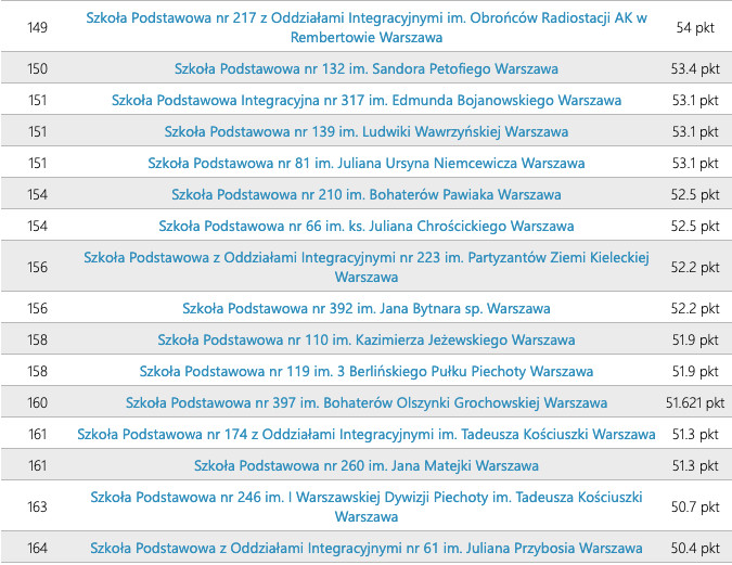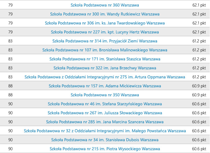 Kilka pozycji niżej - na 35 miejscu - ex equo są SP 303 z Koncertowej i SP 323 z Hirszfelda. Pierwsza ze szkół awansowała aż o 20 pozycji w porównaniu do ubiegłego roku, a druga o trzy.