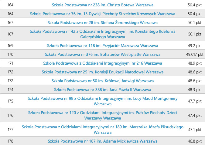 W pierwszej czterdziestce rankingu, na 39 miejscu, znalazła się jeszcze Szkoła Podstawowa nr 319 z ul. ZWM, która w ubiegłym roku była o 28 oczek wyżej.