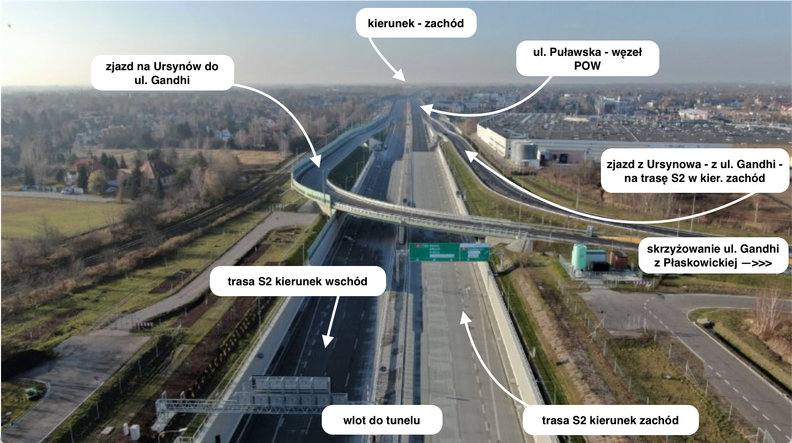 Ursynowianie mogą pojechać ul. Gandhi i zjechać na trasę w kierunku Poznania. Jadąc od strony Poznania, kierowcy mogą też zjechać na Ursynów przez ul. Gandhi (prosto) lub przez Płaskowickiej (skręt w prawo).
