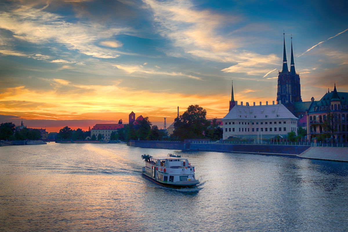 Statek pasażerski na Odrze. W tle Ostrów Tumski z wieżami Archikatedry św. Jana Chrzciciela