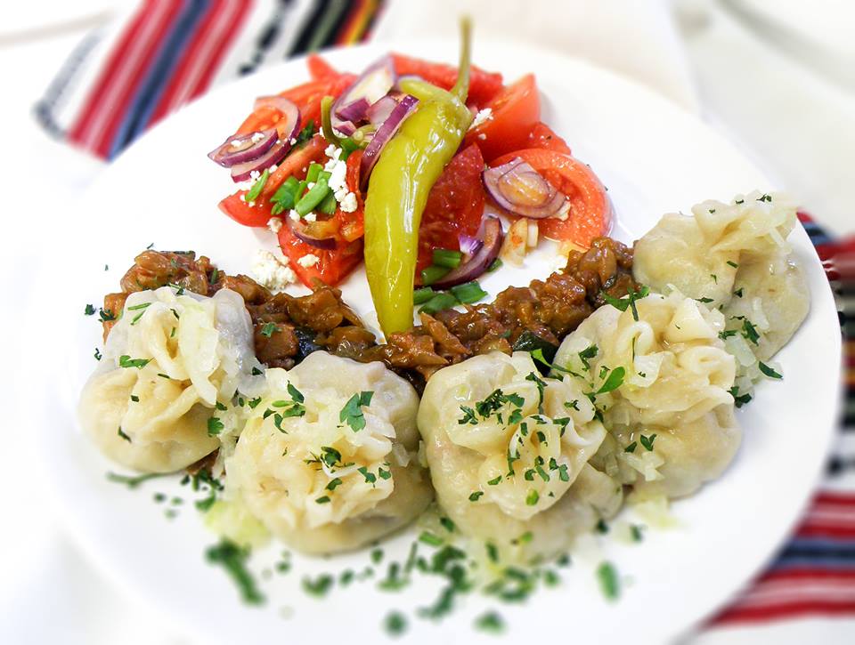 My trafiliśmy na gruzińskie pierożki z mięsem chinkali w trochę innej, niż tradycyjna odsłonie, bo podawane z sosem z bakłażana.